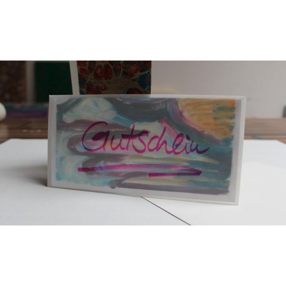 Jeder Gutschein kommt in einer von Regina handbemalten Karte. Sie können sich bei der Abholung eine Karte aussuchen. Sie können auch wählen, was im Gutschein für ein Text stehen soll.
